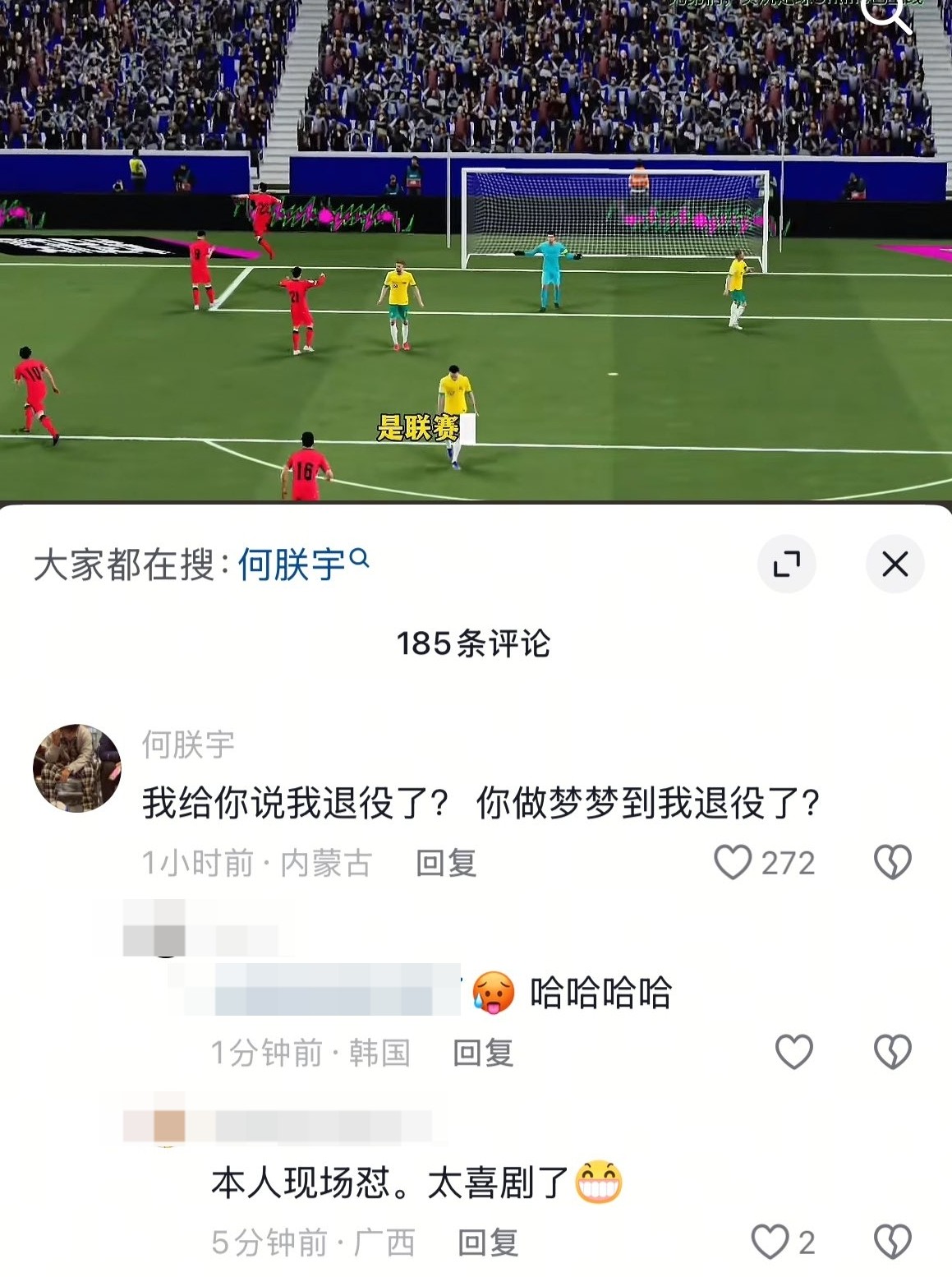 此前,足球频道报道称何朕宇今年合同到期后选择退役,目前正为乌兰察布队参加蒙超联赛(内蒙古自治区足球超级联赛),目前乌兰察布队已经打进了半决赛。