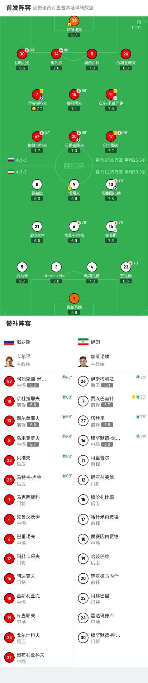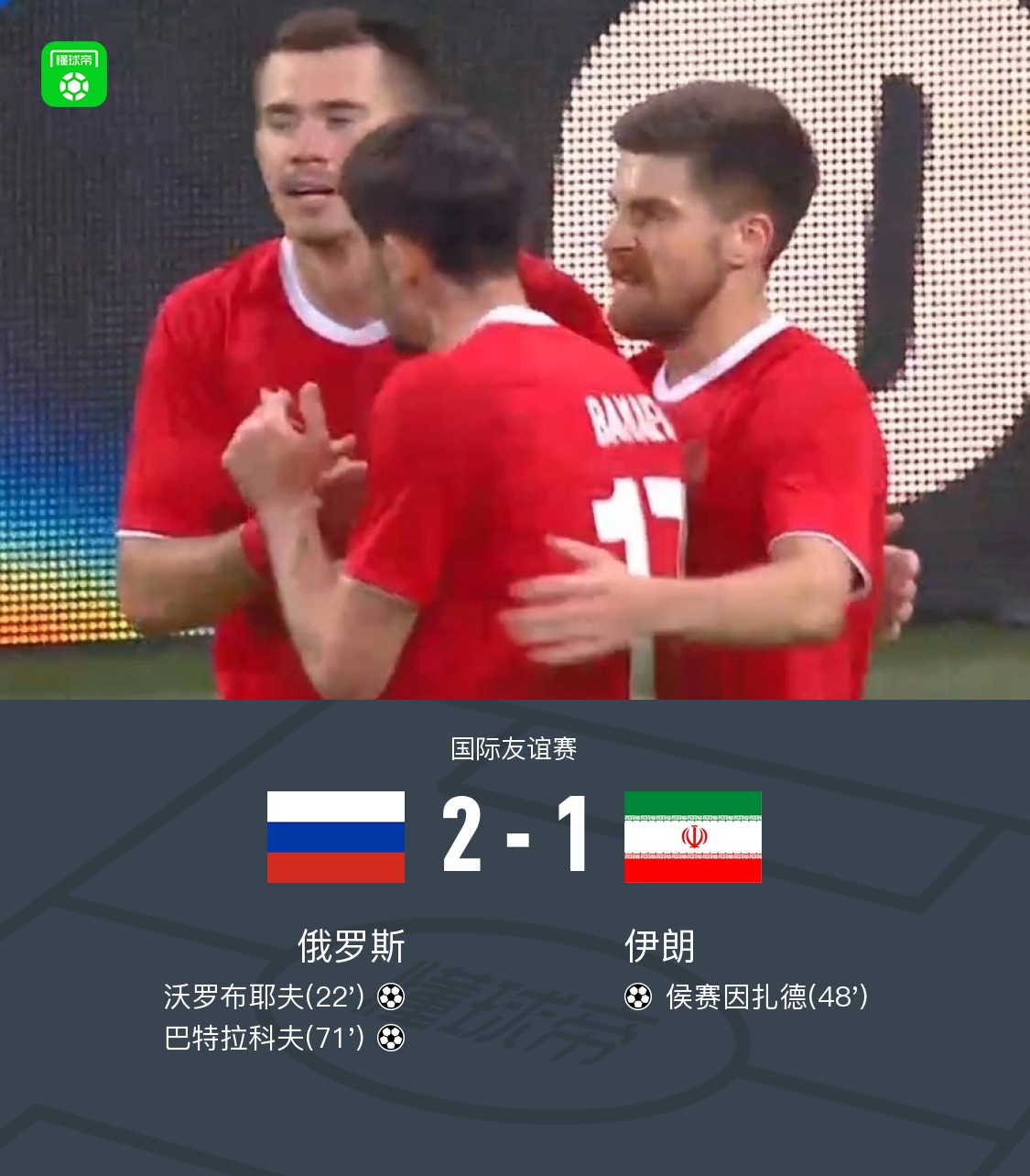 北京时间10月11日国际友谊赛,俄罗斯对阵伊朗。俄罗斯沃罗布耶夫破门,巴特拉科夫破门。伊朗侯赛因扎德破门。最终比分俄罗斯 2–1 伊朗。