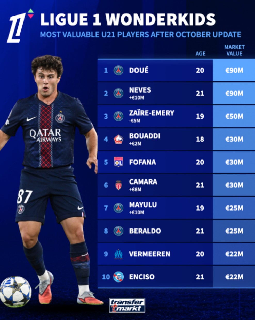 北京时间10月11日,在更新了法甲球员的身价之后,德转还列出了法甲身价排名前10的U21球员,巴黎圣日耳曼包揽前三位,杜埃和若昂-内维斯同以9000万欧元并列第一。