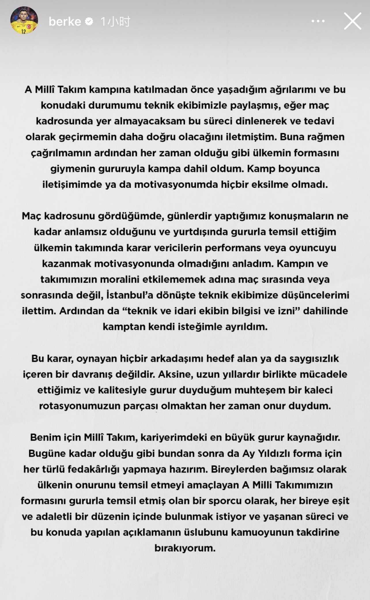 当我看到比赛名单时,我意识到,这些天我们所做的一切交流都变得毫无意义,也明白了,在我自豪地于海外代表祖国的球队中,决策者们的出发点并不是球员的表现或帮助球员成长的意愿。为了不影响集训营和球队的士气,我没有在比赛期间或比赛结束后表达看法,而是在返回伊斯坦布尔后,把自己的想法告诉了教练组。随后,在教练组和管理层的知情与同意下,我主动选择离开了集训营。