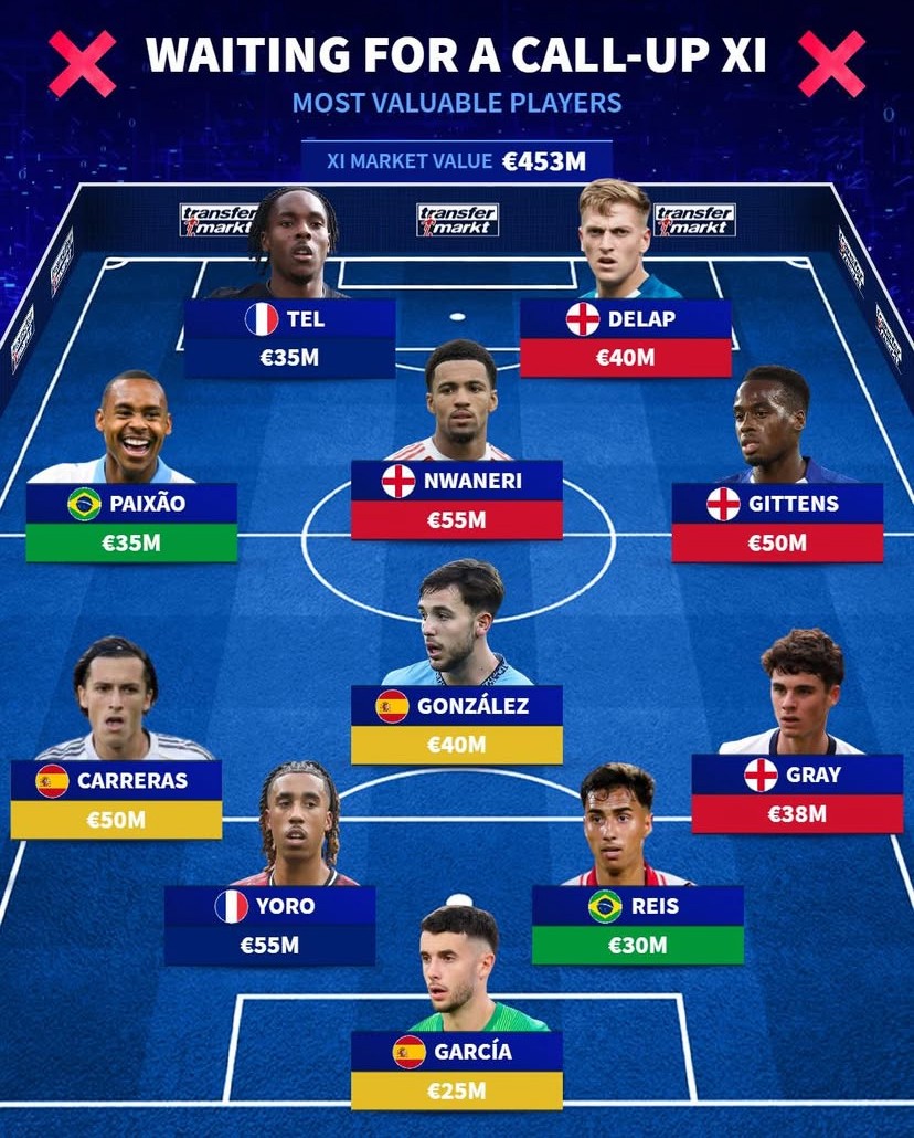 北京时间10月12日,德转列出了从未赢得成年国家队征召最贵11人阵容,约罗和恩瓦内里以5500万欧元的身价领衔,马蒂斯-特尔、利亚姆-德拉普、比诺埃-吉滕斯、尼科-冈萨雷斯、阿尔瓦罗-卡雷拉斯以及霍安-加西亚在列。