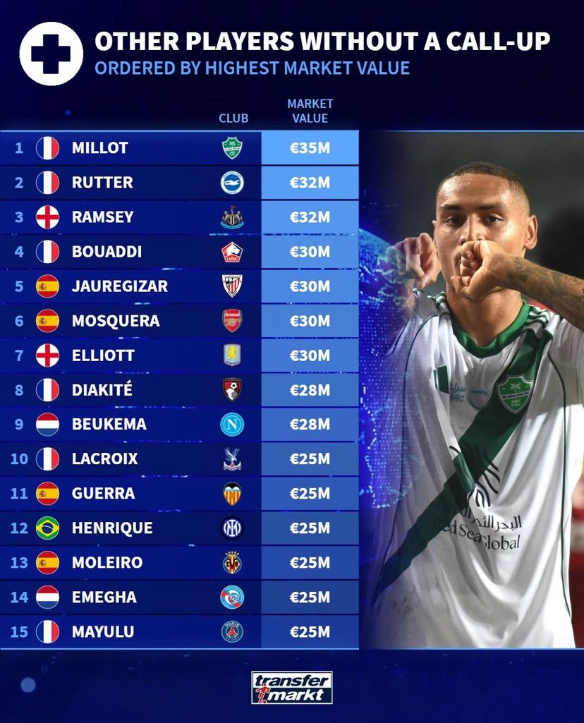 尼科-冈萨雷斯(西班牙/曼城)4000万欧元、比诺埃-吉滕斯(英格兰/切尔西)5000万欧元、恩瓦内里(英格兰/阿森纳)5500万欧元、派尚(巴西/马赛)3500万欧元