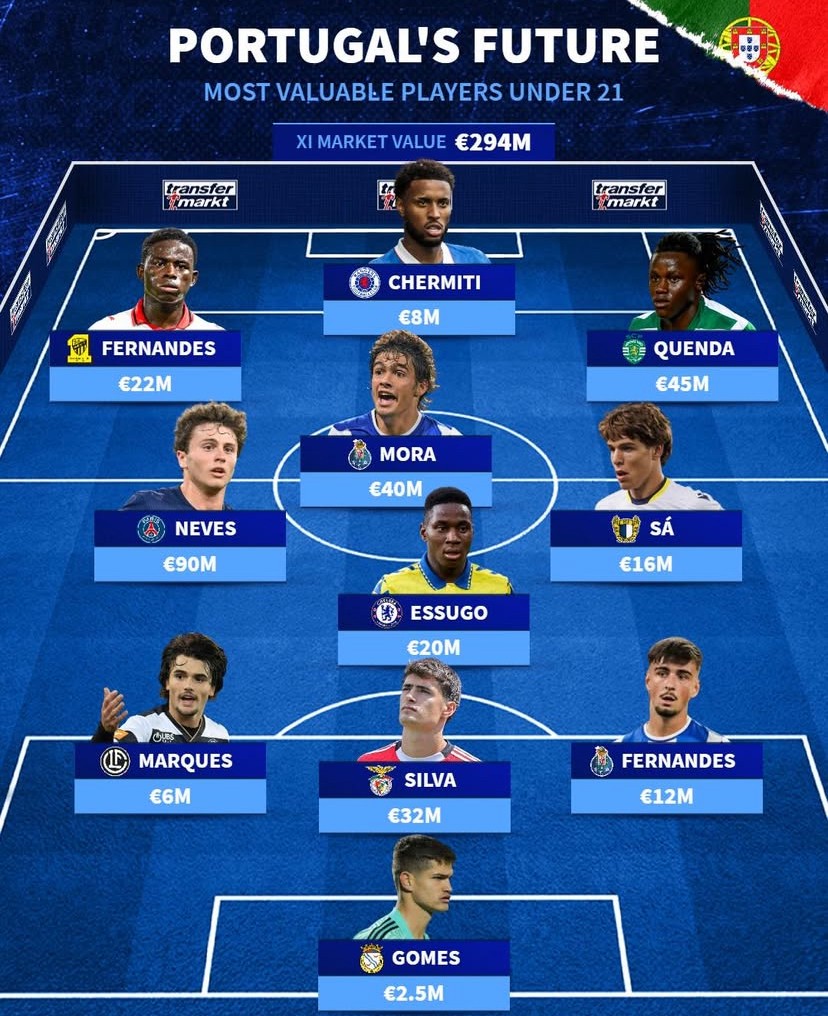 北京时间10月11日,德转列出了葡萄牙身价最高的U21球员阵容,若昂-内维斯以9000万欧元的身价领衔,身价4500万欧元的热奥瓦尼-昆达以及身价4000万欧元的罗德里戈-莫拉在列。