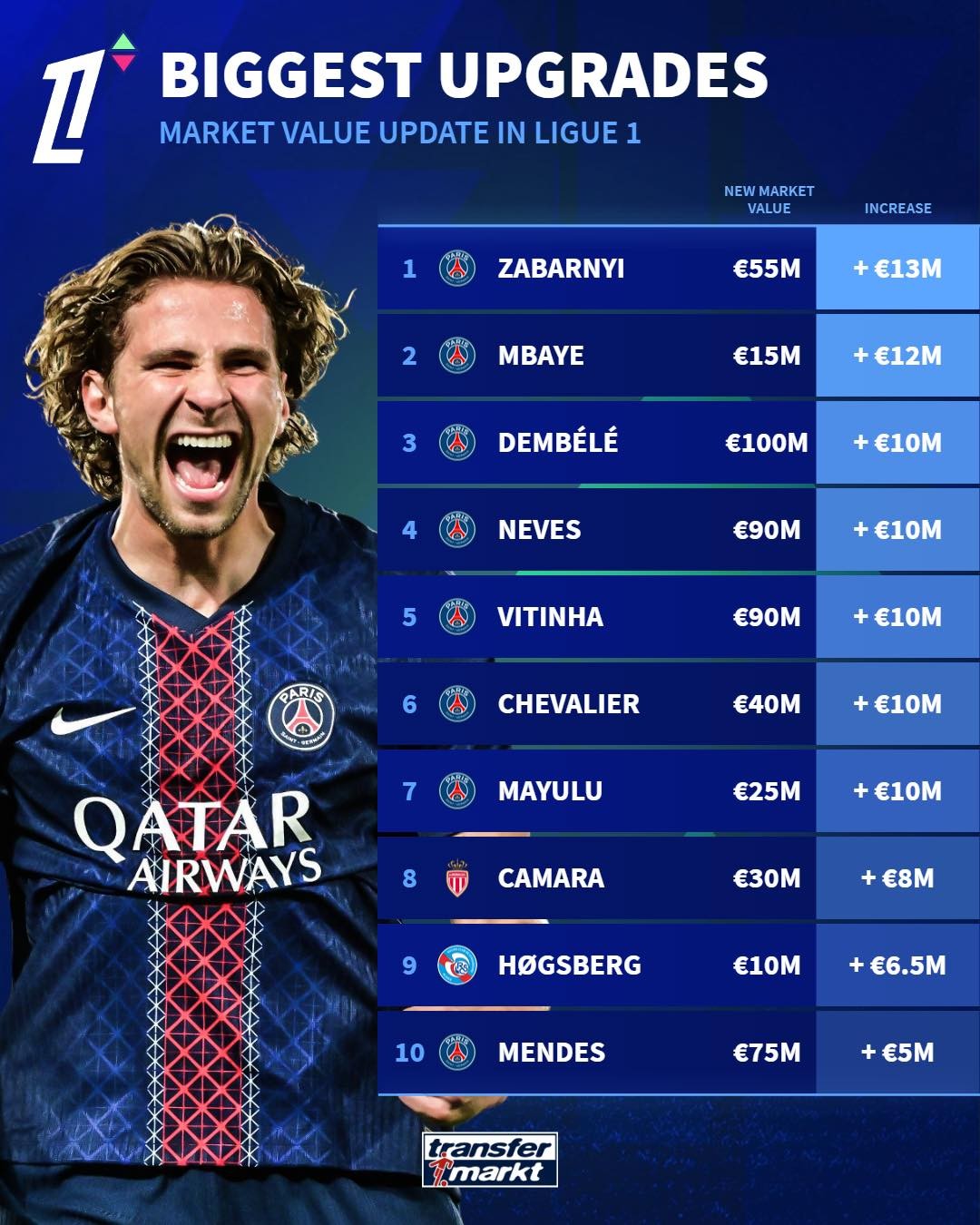 10月,德国转会市场更新了法甲联赛的球员身价,德转统计了法甲球员身价涨幅榜,其中扎巴尔尼1300万欧第一,登贝莱并列第三。