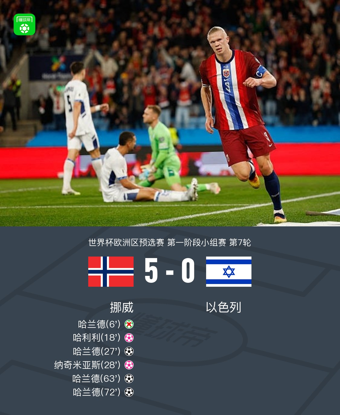 北京时间10月12日世界杯欧洲区预选赛 第一阶段小组赛 第7轮,挪威对阵以色列。挪威哈兰德帽子戏法。以色列哈利利,纳奇米亚斯自摆乌龙。最终比分挪威 5–0 以色列。