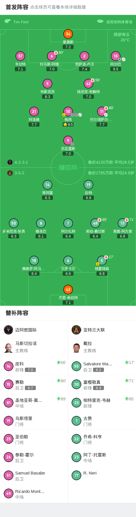 第52分钟,梅西斜长传,阿尔巴插上挑射破门,迈阿密国际2-0