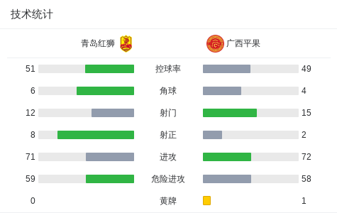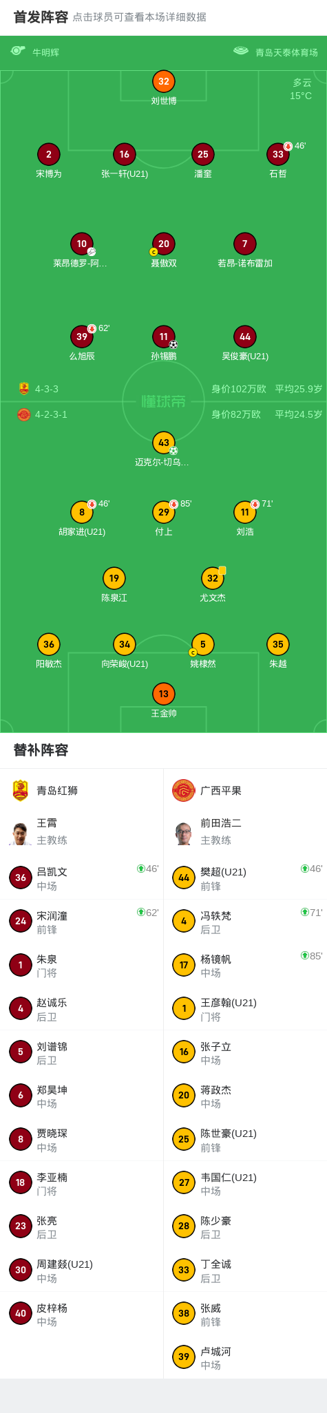 北京时间10月12日中甲联赛第26轮,青岛红狮主场对阵广西平果。孙锡鹏头球破门先拔头筹。随后广西平果获得点球机会,迈克尔-切乌库阿点射破门扳平比分。随后双方均未能再改写比分。最终青岛红狮1–1战平广西平果。