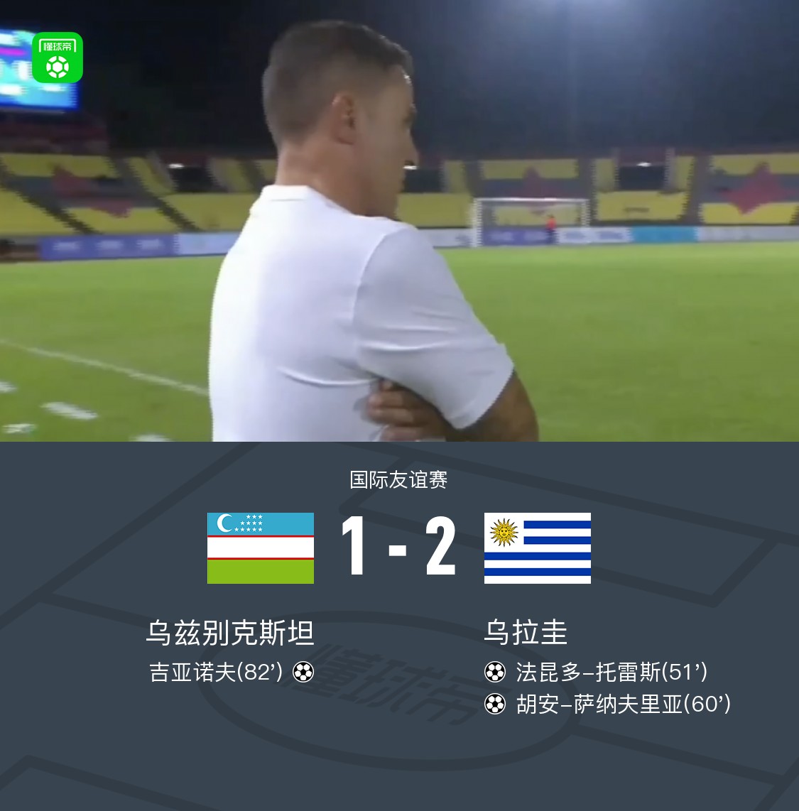 国际友谊赛,乌兹别克斯坦与乌拉圭展开对决。比赛中,乌拉圭率先发力,比尼亚斯送出助攻,法昆多-托雷斯接球后完成破门,为球队取得领先。随后,比尼亚斯再次策动进攻,精准传递帮助胡安-萨纳夫里亚推射得分,进一步扩大优势。比赛进入尾声阶段,乌兹别克斯坦由吉亚诺夫抓住机会扳回一城,但未能扭转局势。最终全场比赛结束,比分定格在乌兹别克斯坦 1-2 乌拉圭。