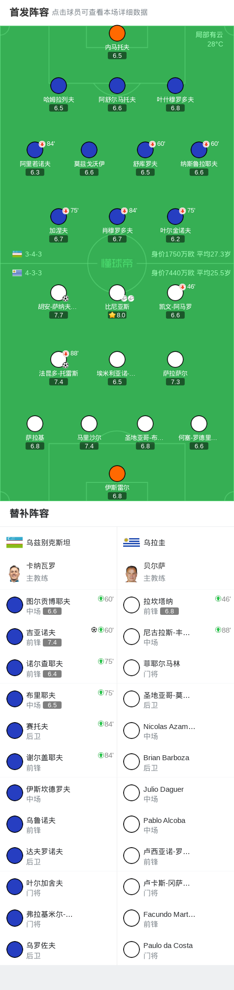 第82分钟,吉亚诺夫门前补射破门,乌兹别克斯坦1-2落后乌拉圭