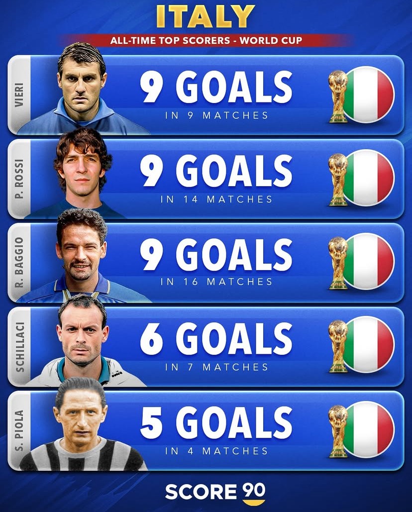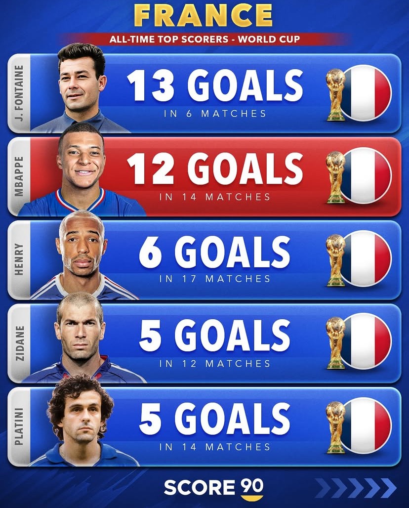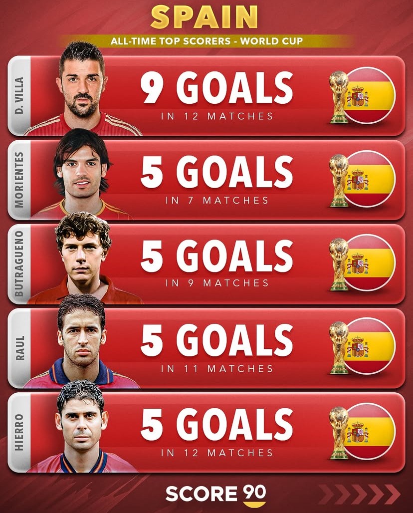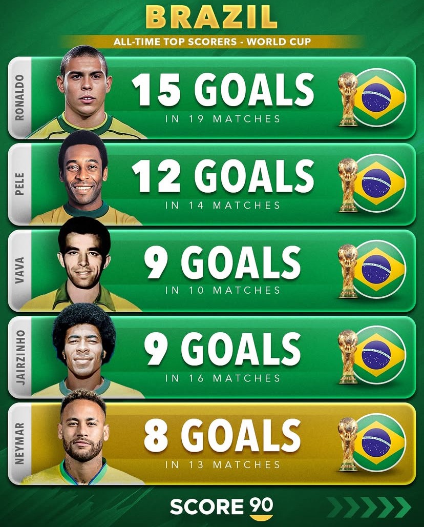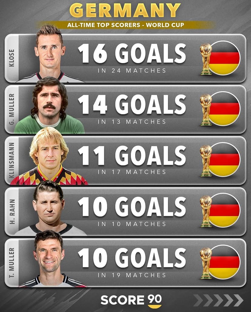 北京时间10月13日,Score 90统计出了法国、阿根廷、葡萄牙、巴西、西班牙、英格兰、德国以及意大利8支国家队的世界杯射手王,其中克洛泽以16球排名所有球员之首,罗纳尔多15球位列第二,梅西与方丹同以13球并列第三位。
