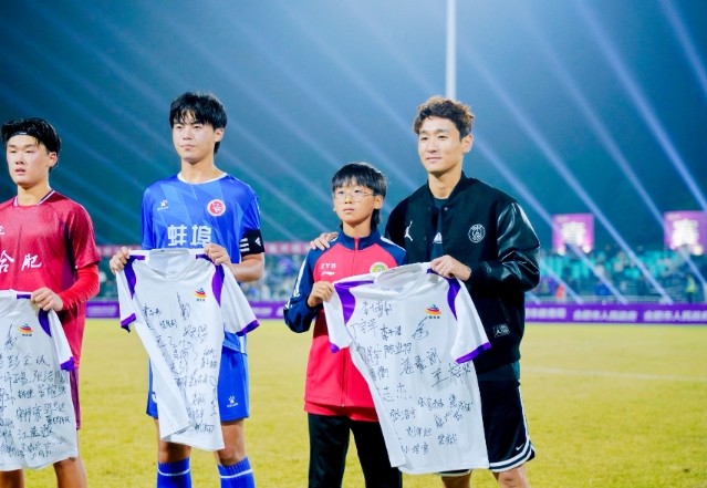 比赛中场休息期间,安徽籍国脚韦世豪带领数千观众齐呼“徽青赛,青春上场!”的口号,随后,他与合肥、蚌埠、安徽青训三支队伍的队长互赠了写满队员签名和梦想寄语的珍贵球衣,这一充满温情的环节,完美诠释了安徽足球精神的传承与未来。