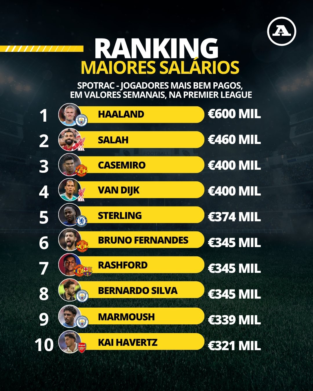 北京时间10月13日,《球报》列出了英超目前周薪最高的前十位球员,哈兰德60万欧元居首,萨拉赫、卡塞米罗紧随其后。