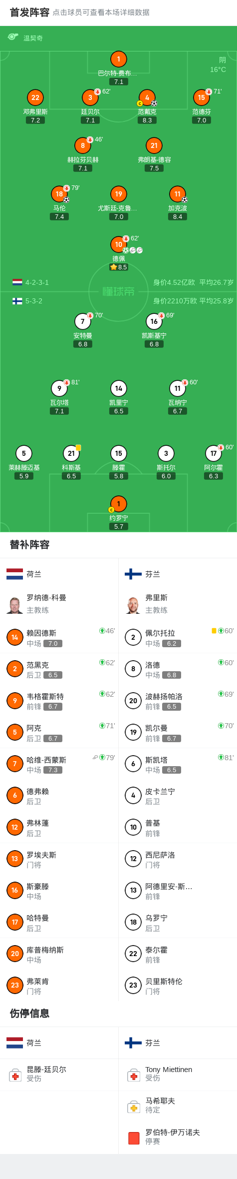 第17分钟,德佩开出任意球,范戴克头球破门,荷兰2-0芬兰
