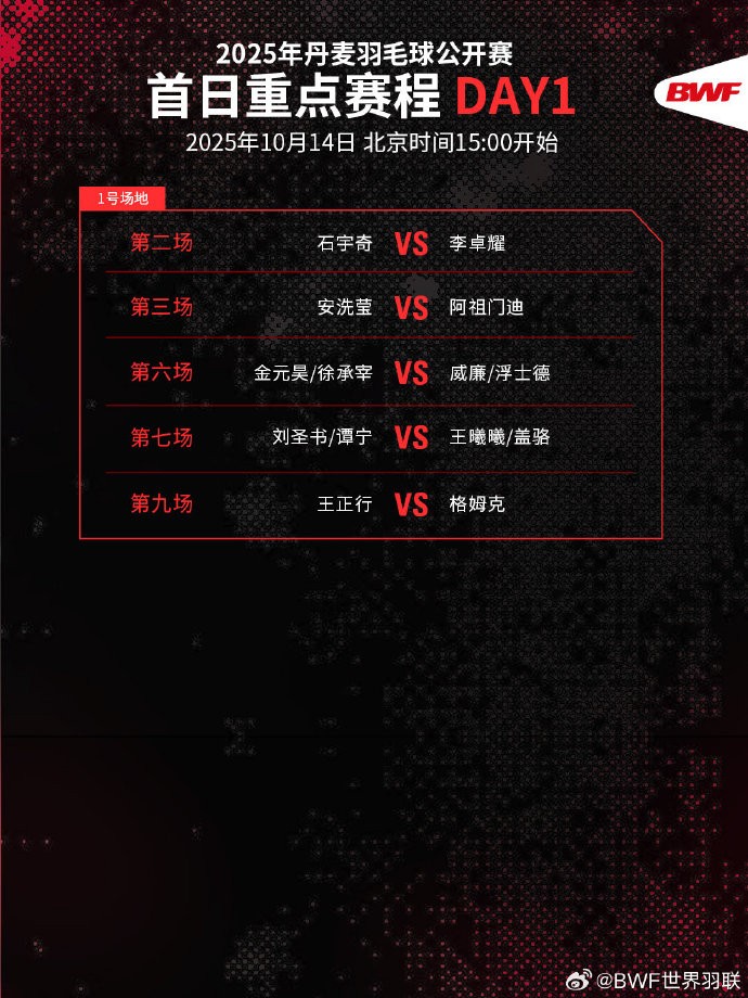 10月14日,丹麦羽毛球公开赛今日打响,国羽全主力出战。石宇奇将迎来巴黎世锦赛夺冠后的首次亮相。