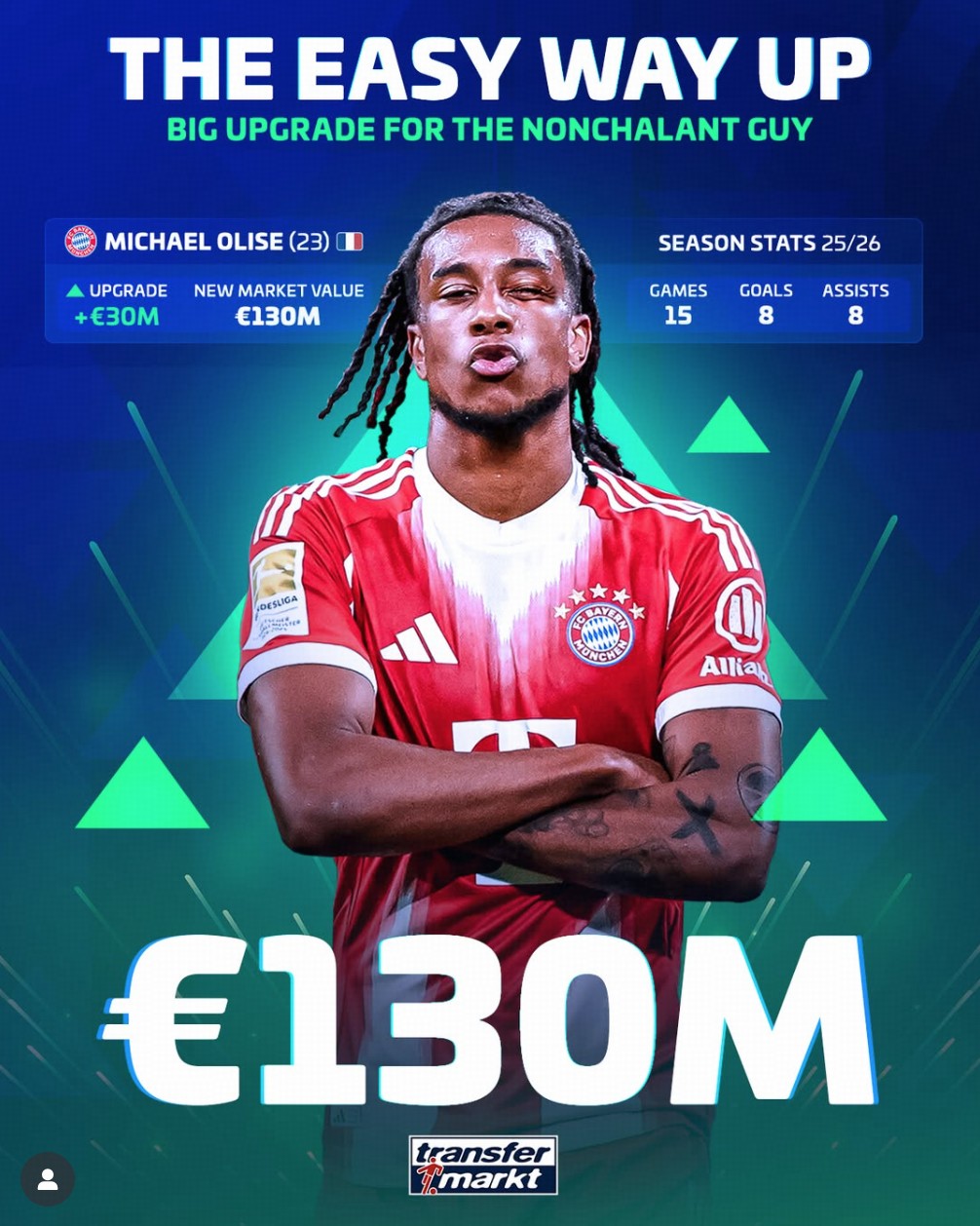 1-奥利塞(拜仁)涨幅:3000万欧 身价:1.3亿欧