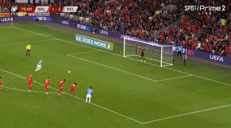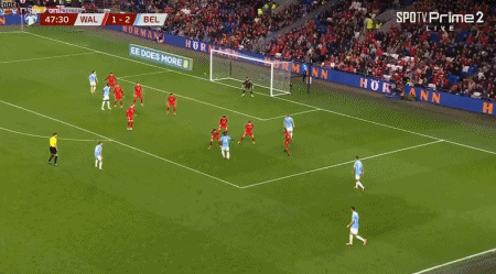 第75分钟,詹姆斯手球送点,德布劳内主罚点球命中,比利时3-1威尔士