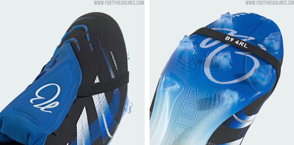 球鞋上的三条纹采用新颖的设计,具有渐变效果,从白色过渡到蓝色再到黑色,中间有一条灰色条纹,蓝白两色是伯明翰的代表色,鞋舌带上印有字母B9 4RL,这是贝林厄姆在伯明翰长大的邮编。