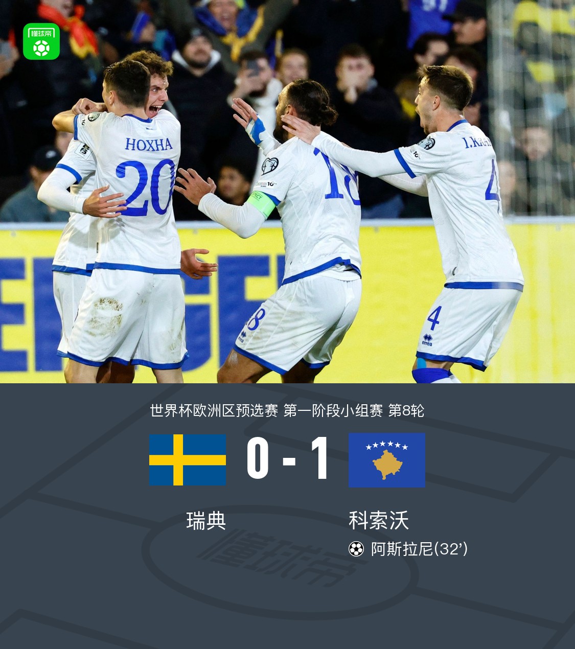 北京时间10月14日世界杯欧洲区预选赛 第一阶段小组赛 第8轮,瑞典对阵科索沃。科索沃阿斯拉尼破门。最终比分瑞典 0–1 科索沃。