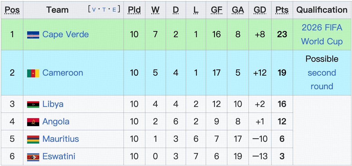 佛得角在输给喀麦隆后,1-0击败利比亚,1-0小胜毛里求斯,客场2-1击败安哥拉,客场2-0击败毛里求斯。与此同时,喀麦隆却在客场0-0被本组五档队斯威士兰逼平,就是这次关键的翻车,让佛得角在9月9日与喀麦隆的决战前,以16分力压喀麦隆的15分。