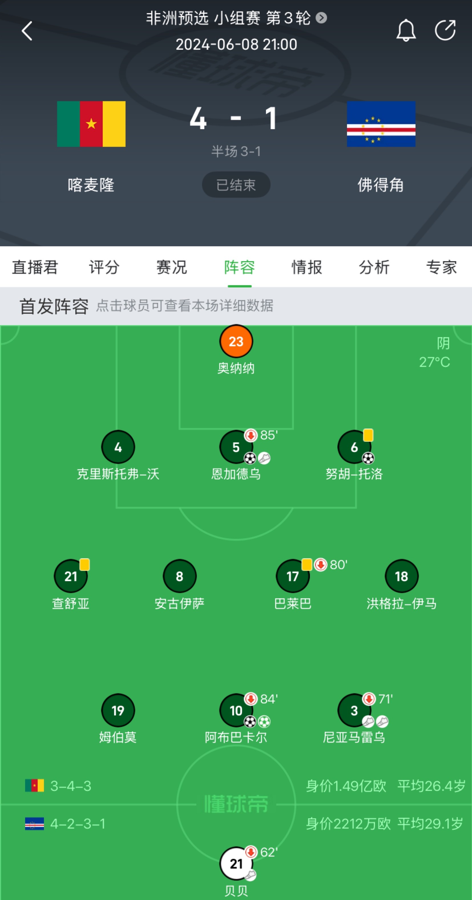 喀麦隆拥有姆伯莫、巴莱巴、奥纳纳、安古伊萨、埃永、查舒亚、阿布巴卡尔、舒波莫廷等名将,还有中超北京国安队的外援中卫恩加德乌。无论从历史底蕴,还是阵容实力,喀麦隆都全面碾压佛得角,当两队在第3轮相遇时,喀麦隆4-1轻取佛得角,恩加德乌传射建功。