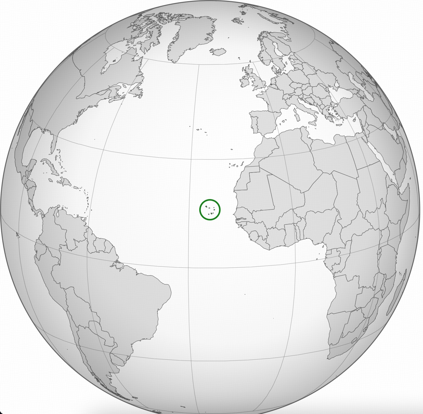 佛得角的首都普拉亚地处北纬14.5°,西经23.3°,向东与西非国家塞内加尔隔海相望,相距500多公里。佛得角的名字(Cape Verde)正是来自塞内加尔西海岸的佛得角半岛,在葡萄牙语里,它的意思是“绿色的海角”。