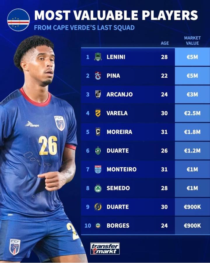 洛甘-科斯塔是佛得角唯一一位身价500万欧以上的球员。本期佛得角大名单里,球队总身价仅有2700万欧。就是这样一支平民军团,最终创造了奇迹。