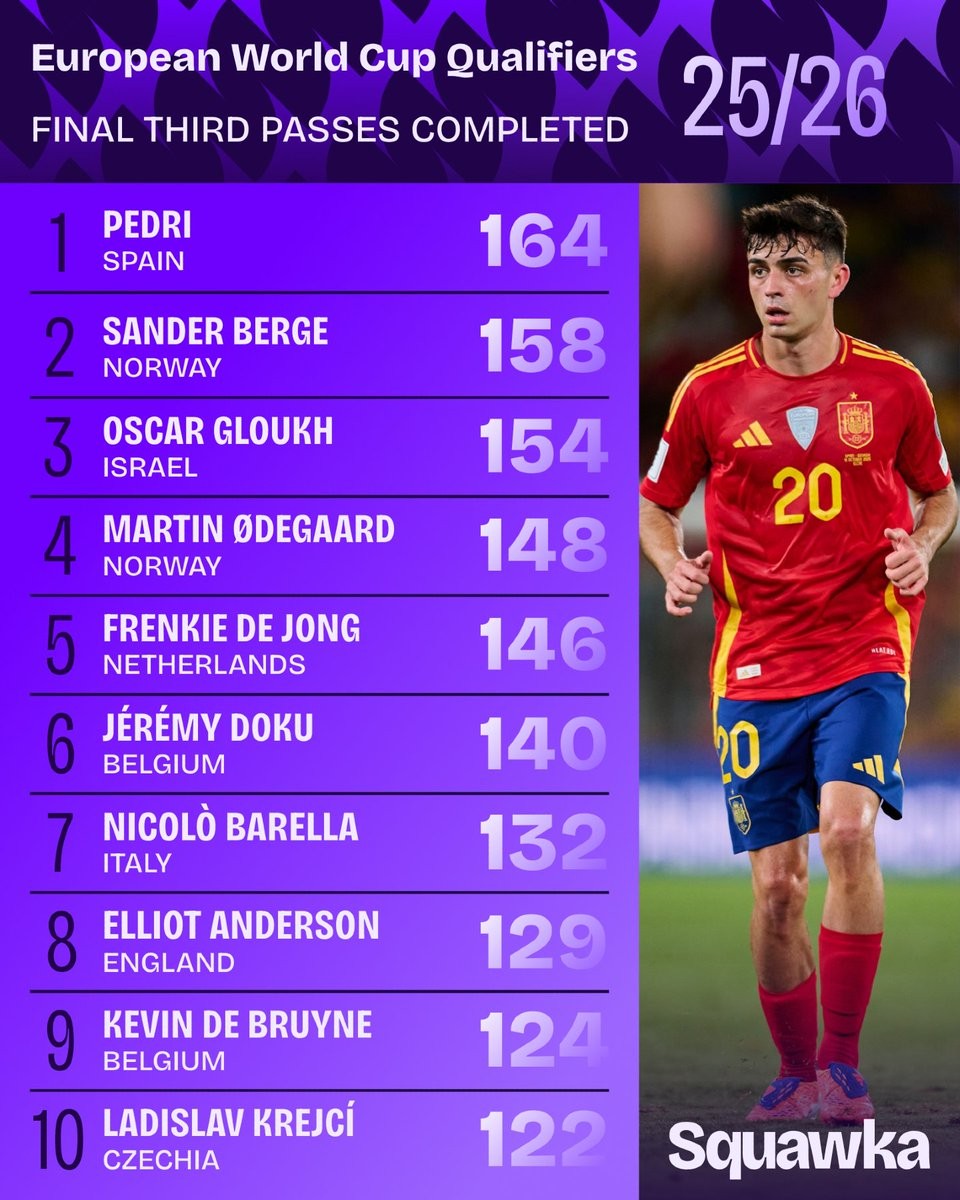 北京时间10月15日,本次国际比赛日的世界杯欧洲区预选赛全部结束,佩德里在世欧预进攻三区的传球次数达164次,排名第一。