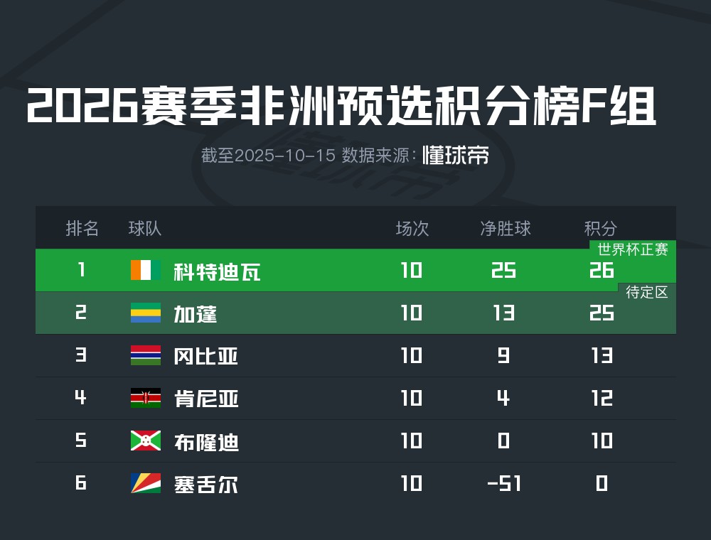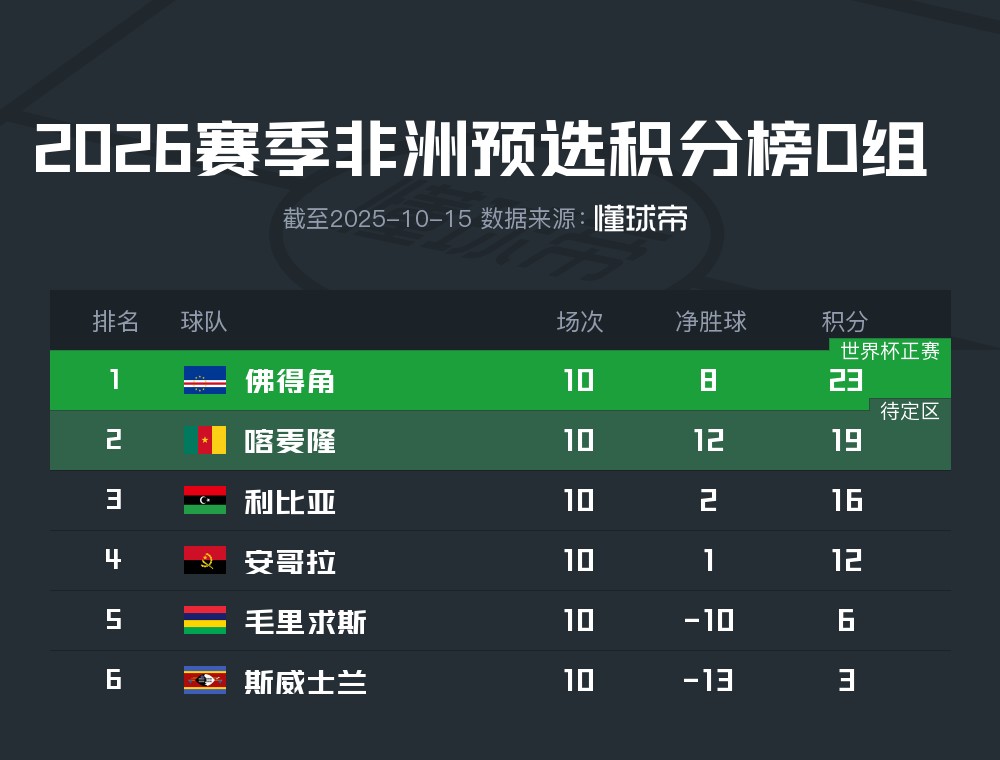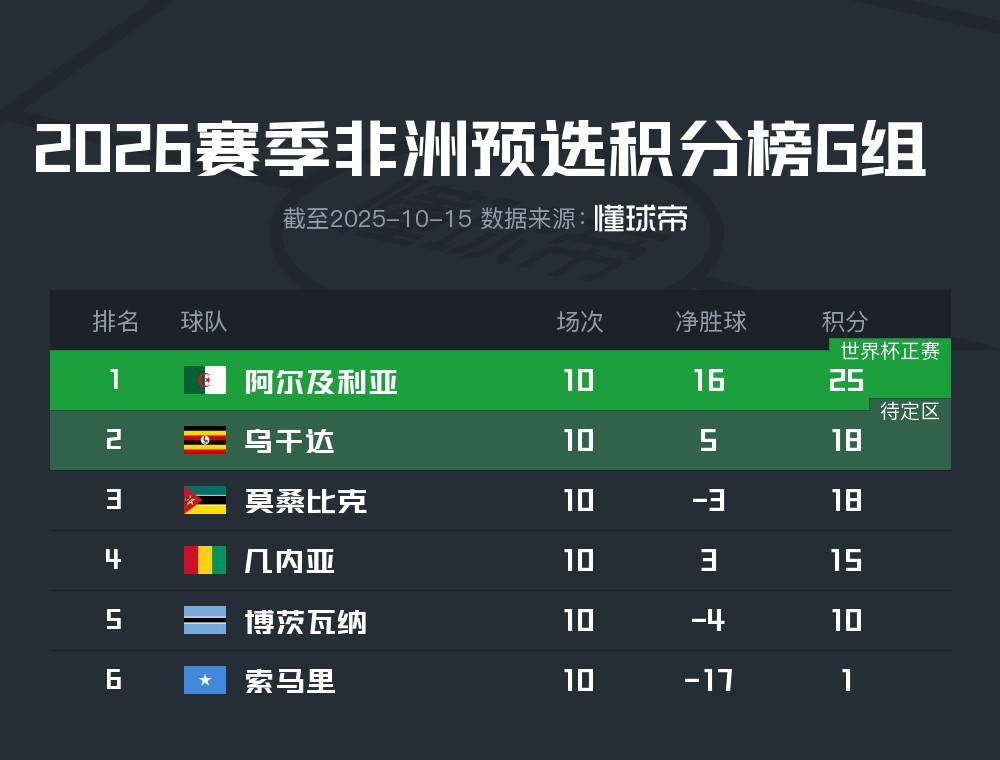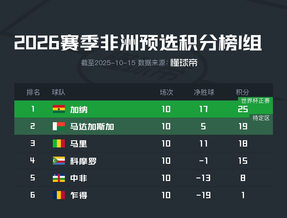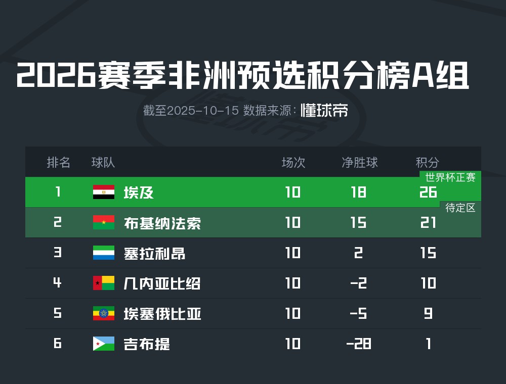 在9月份的世界杯非洲区预选赛的比赛中,摩洛哥5-0大胜尼日尔之后,成为了首支晋级2026年世界杯的非洲球队。A组的埃及和G组的阿尔及利亚均以3-0的比分击败对手后提前1轮晋级世界杯决赛圈。D组的佛得角在世界杯预选赛最后一轮的比赛中,3-0力克斯威士兰首次闯进世界杯。而H组的突尼斯在预选赛中9胜1平保持不败,以较大的优势锁定世界杯正赛资格。I组的加纳队在最后1轮的比赛中1-0击败科摩罗同样顺利晋级。