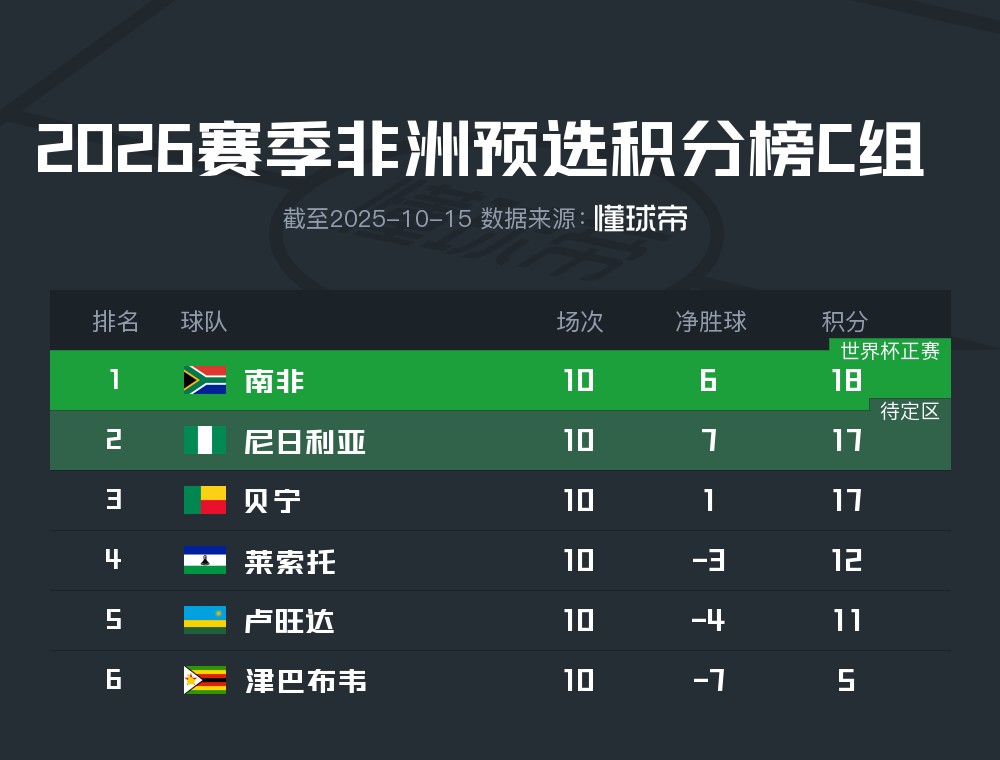 北京时间10月15日凌晨,世界杯非洲区预选赛最后一轮的比赛全部结束,C组两场关键对决中,尼日利亚4-0贝宁,而南非3-0战胜卢旺达之后反超贝宁1分晋级世界杯决赛圈。B组的塞内加尔和F组的科特迪瓦均大胜对手晋级2026美加墨世界杯正赛。