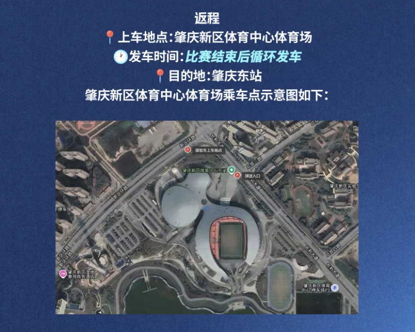 深圳新鹏城官方消息称,为方便乘坐高铁或动车抵达的球迷前往观赛,俱乐部特别安排由肇庆东站往返肇庆新区体育中心体育场的免费接驳车服务。