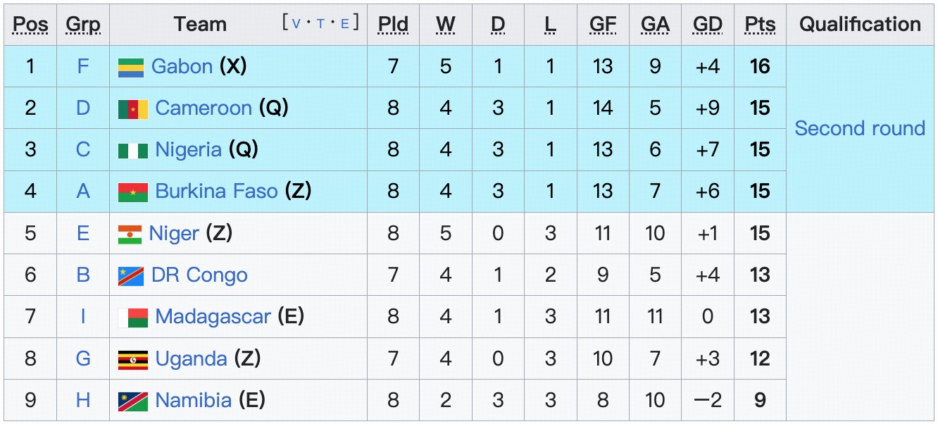在奥斯梅恩戴帽帮助球队3-0领先贝宁后,尼日利亚已经锁定了小组第二位。根据赛制,非洲区9个小组第二里的前四名将晋级附加赛,争夺一个洲际附加赛席位。由于E组厄立特里亚退赛,导致各组球队不均,因此在对比小组第二名的成绩时要去掉与最后一名的成绩。而尼日利亚此前两战垫底队津巴布韦均战平的糟糕战绩反而成为了“优势”,他们只需要扣除2分、2进球、2失球即可。