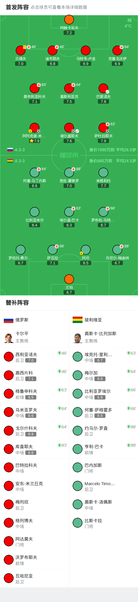 北京时间10月15日国际友谊赛,俄罗斯对阵玻利维亚。俄罗斯萨杜拉耶夫破门,阿列克谢-米兰丘克破门,谢尔盖耶夫破门。最终比分俄罗斯 3–0 玻利维亚。