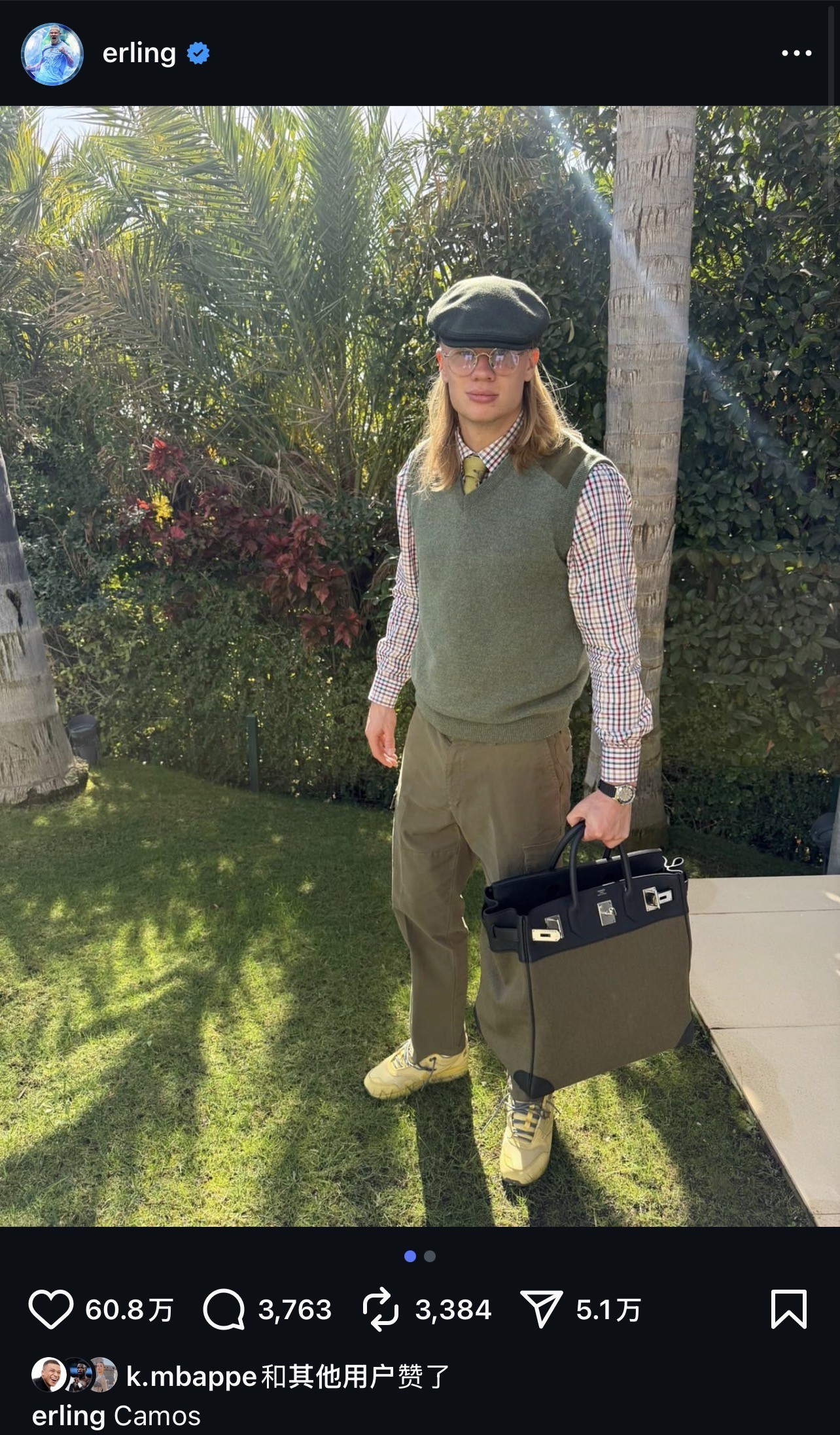 周二,哈兰德在社交媒体上发布了一张度假照片,展示了他独特的新时尚风格。照片中,他身穿绿色长裤与配套背心,搭配格子衬衫、领带和平顶帽,手中拎着一个奢华的爱马仕Hac 40手袋。据悉,这款包的价格高达1万英镑。哈兰德在配文中仅写Camos。