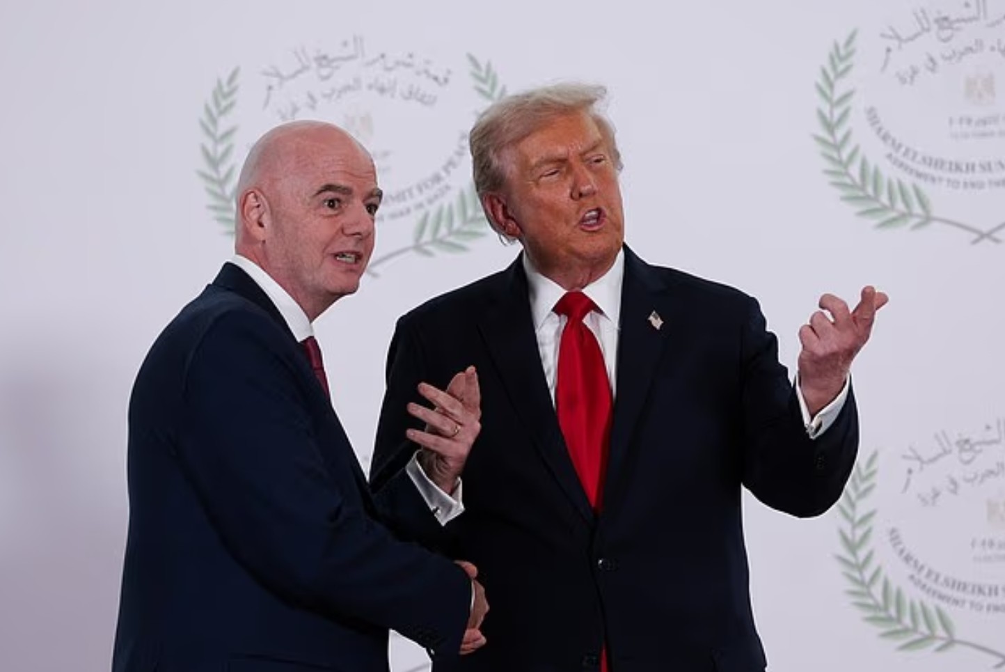 据《邮报》消息,国际足联主席因凡蒂诺在埃及出席加沙和平峰会,并与美国总统特朗普合影。