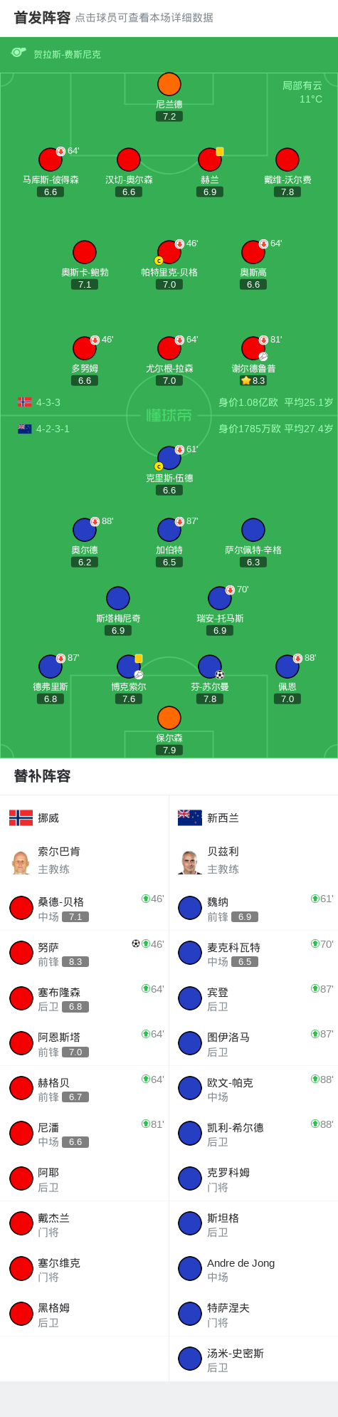 北京时间10月15日国际友谊赛,挪威与新西兰展开对决。上半场补时阶段,博克索尔送出助攻,芬-苏尔曼破门得分。易边再战,谢尔德鲁普助攻努萨推射入网,帮助球队扳平比分。最终双方以1比1握手言和。