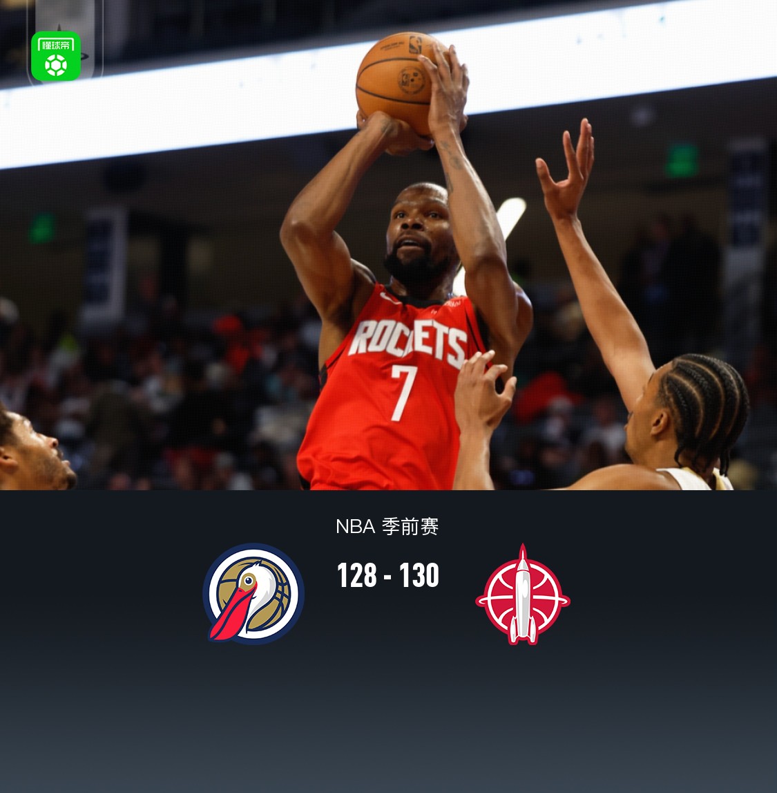 北京时间10月15日NBA 季前赛,新奥尔良鹈鹕对阵休斯顿火箭。半场鹈鹕59-60火箭,最终鹈鹕128-130火箭。