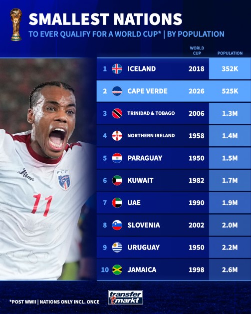 北京时间10月14日,在非洲小国佛得角成功晋级2026年美加墨世界杯之后,德转统计出了自二战以来首次晋级世界杯人口最少的10个国家,冰岛排名第1,佛得角第2。