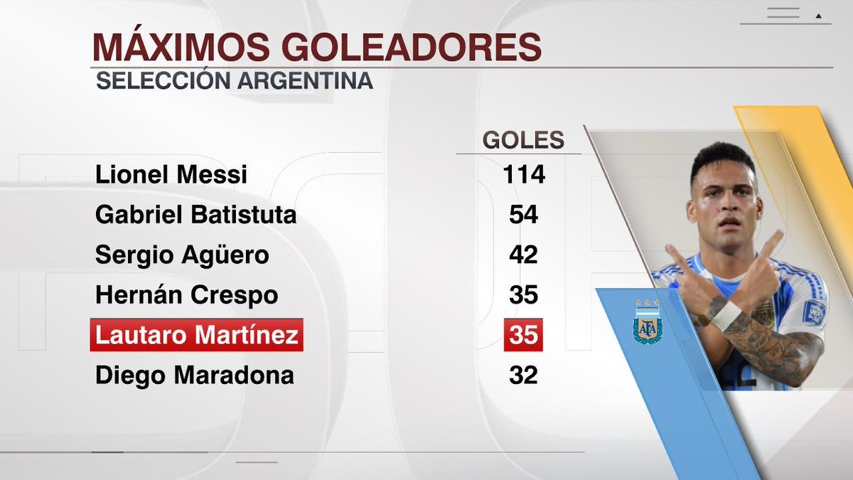 在与波多黎各的国际友谊赛中打入两球后,劳塔罗-马丁内斯国家队生涯已打入35球,这使得他追平克雷斯波,升至阿根廷队史射手榜第四,仅次于梅西、巴蒂斯图塔和阿圭罗。