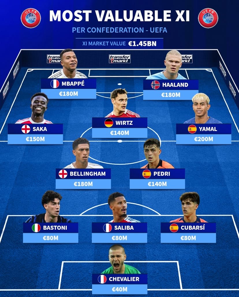 佩德里(西班牙/巴塞罗那)1.4亿欧元、贝林厄姆(英格兰/皇家马德里)1.8亿欧元、亚马尔(西班牙/巴塞罗那)2亿欧元、维尔茨(德国/利物浦)1.4亿欧元、萨卡(英格兰/阿森纳)1.4亿欧元