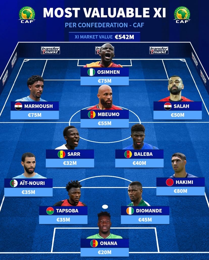 北京时间10月16日,德转列出了目前非洲球员中身价最高的11人阵容,身价8000万欧元的阿什拉夫领衔,身价7500万欧元的奥斯梅恩和马尔穆什在列,此外萨拉赫、姆伯莫以及奥纳纳也都榜上有名。