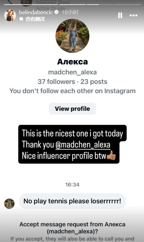 最后面对第三则‘别再打网球了,loser’的留言,本西奇以反讽回应:这是我今天收到最友善的私信,谢谢。