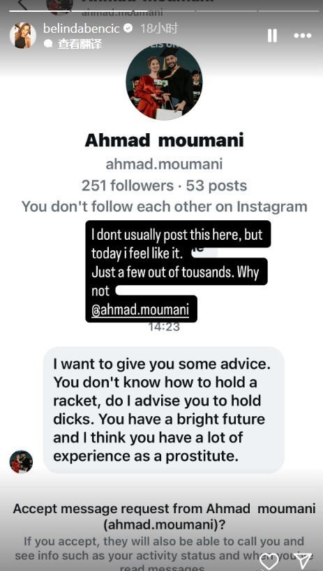 10月15日,宁波网球公开赛第二轮,本西奇苦战3小时33分钟2-1逆转资格赛选手斯塔罗杜布采娃,挺进八强。虽然赢得了比赛,但本西奇还是在社媒遭到网暴,她被评论:连握拍都不会就该去接客,当妓女更有前途。