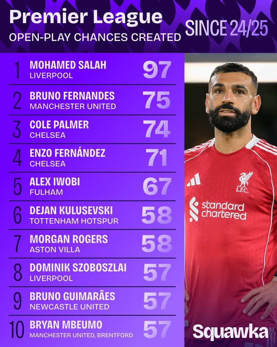 据数据网站Squawka统计,自2024-25赛季以来,萨拉赫是英超运动战创造机会次数最多的球员,布鲁诺-费尔南德斯排名第二。