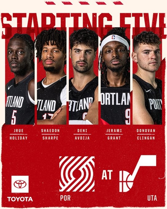 开拓者队首发阵容:朱-霍勒迪、谢登-夏普、德尼-阿夫迪亚、杰拉米-格兰特、多诺万-克林根。