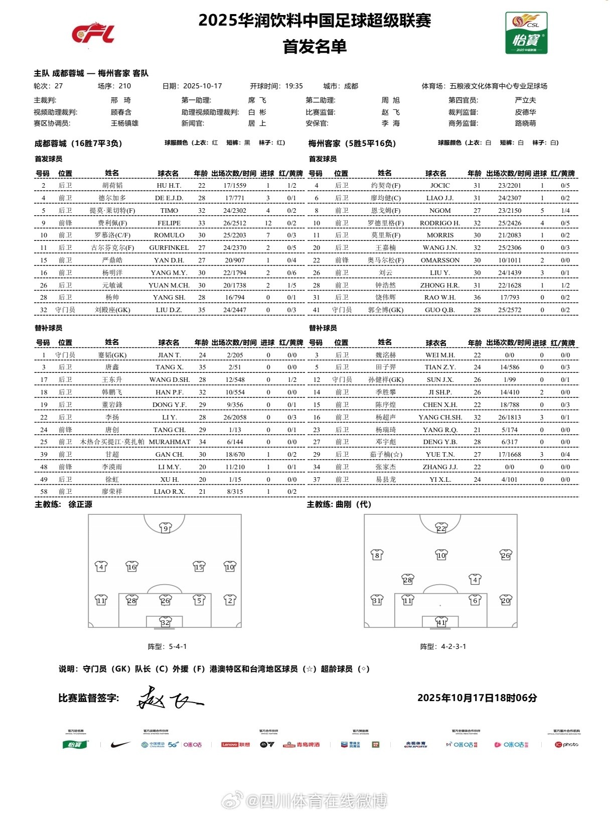 北京时间10月17日19:35,中超第27轮的一场对决。成都蓉城坐镇主场,迎战梅州客家。赛前,双方的阵容公布如下: 文章导航 陈涛:国安是唯一联赛杯赛均有机会争冠的队伍,我们尊重对手 德天空:格策与法兰克福开启续约谈判,目前不考虑去美职联