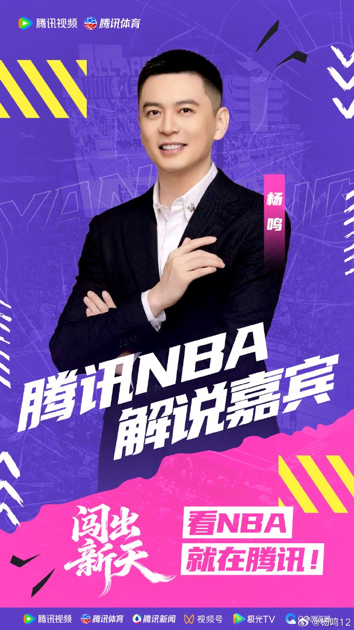 杨鸣在微博上写道:“新赛季期待与球迷们在腾讯NBA相见!每次跟大家一起看球聊球,既是欣赏比赛也是学习的过程,希望新赛季与球迷们共同见证更多精彩瞬间,也期待看到我们的杨瀚森在NBA赛场上‘闯出新天’!”
