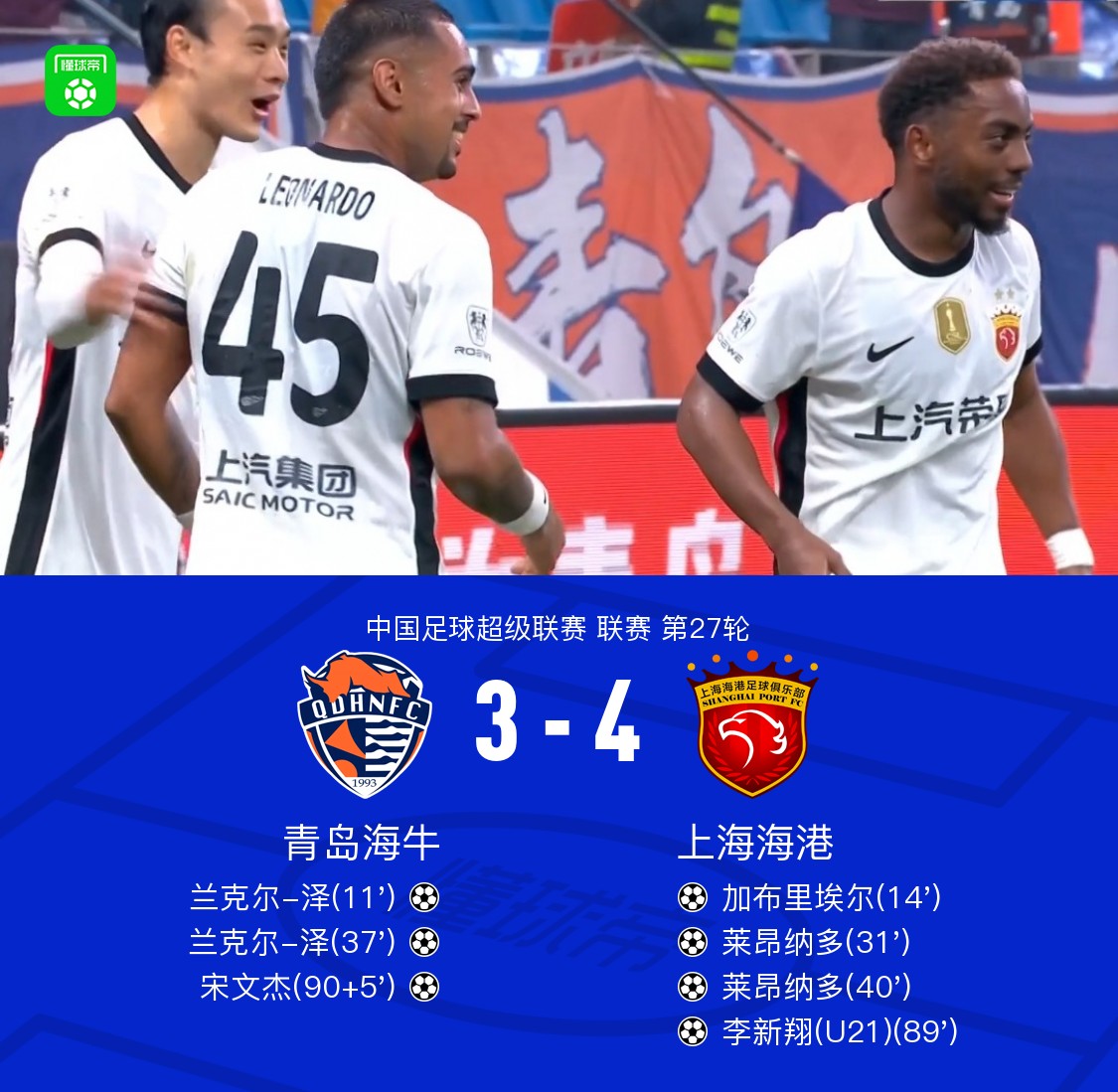 北京时间10月17日中国足球超级联赛 联赛 第27轮,青岛海牛主场对阵上海海港。青岛海牛兰克尔-泽梅开二度,宋文杰破门。上海海港加布里埃尔破门,莱昂纳多梅开二度,李新翔破门。最终比分青岛海牛 3–4 上海海港。