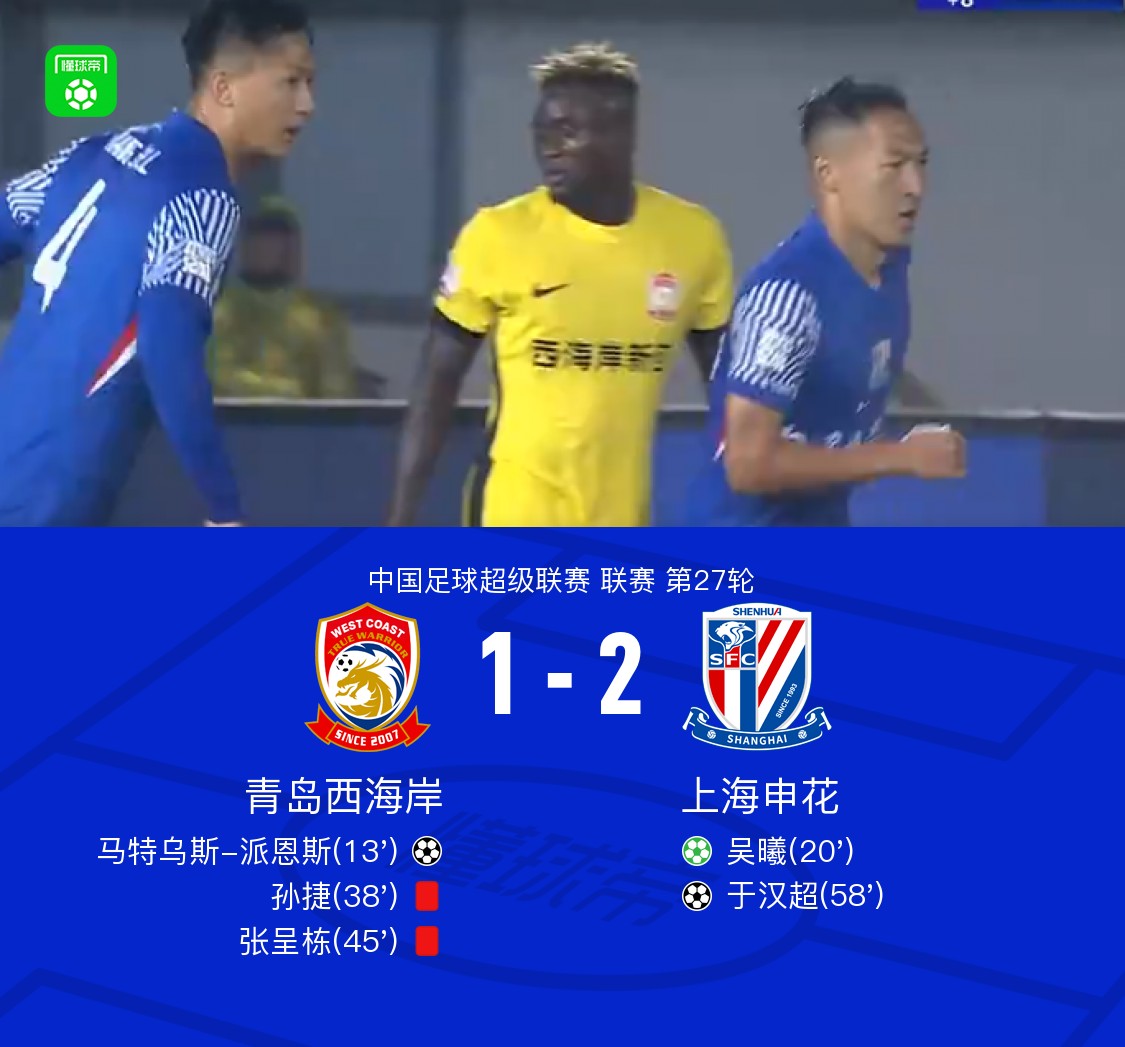 北京时间10月17日,中超联赛第27轮展开角逐,青岛西海岸坐镇主场迎战上海申花。上半场,马特乌斯头球破门先拔头筹,吴曦点射扳平比分。孙捷对于汉超犯规吃到红牌,张呈栋不满判罚也吃到红牌;下半场,于汉超头球破门反超比分,李昊连续扑救力保城池。最终,上海申花客场2-1逆转9人作战的青岛西海岸。