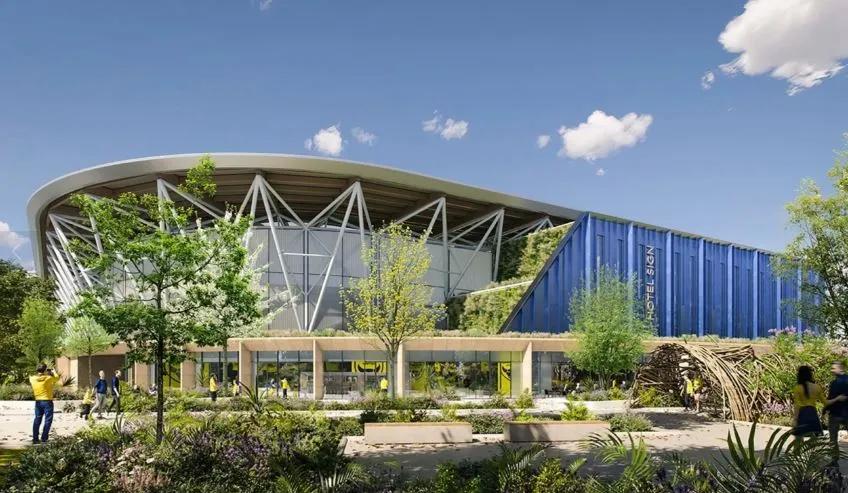 根据官方效果图,新球场外观将采用玻璃幕墙设计,兼具现代感与开放性。除比赛设施外,还将建设一座180间客房的酒店、餐厅、会议中心、健身与健康中心、社区广场等多功能空间,形成集体育、休闲与商务为一体的综合体。