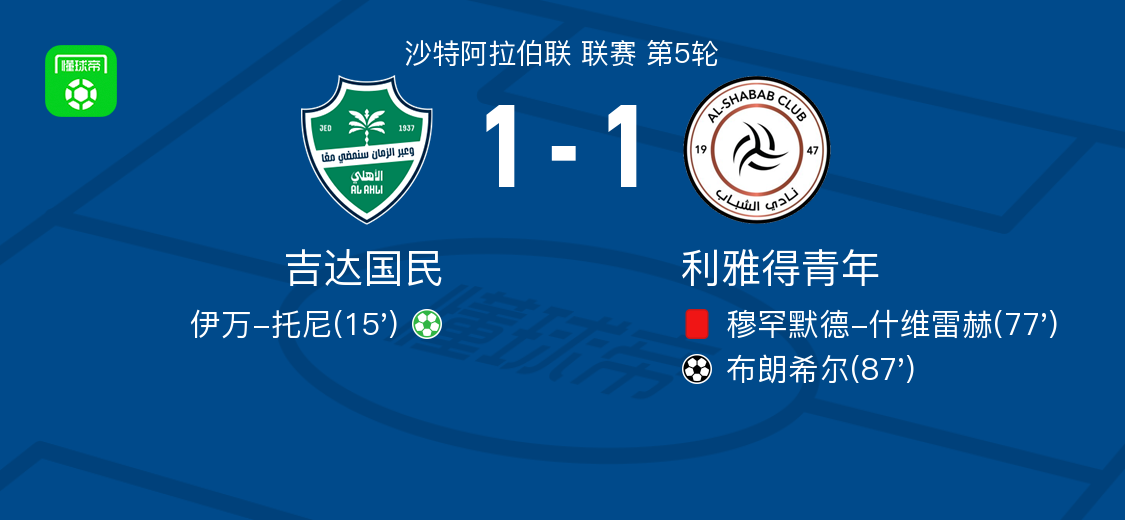 北京时间10月18日沙特阿拉伯联 联赛 第5轮,吉达国民主场对阵利雅得青年。吉达国民伊万-托尼破门。利雅得青年布朗希尔破门。最终比分吉达国民 1–1 利雅得青年。